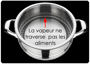 - Cette vapeur réellement "douce", monte par les cotés sans traverser l’aliment afin de ne pas l’altérer. Elle agit simplement comme un conducteur de chaleur qui est uniquement destiné à faire monter la température dans le panier de façon à ce que la cuisson puisse s’effectuer, mais ne sert pas directement à cuire l’aliment lui même. C'est le principe de la cuisson a l'étouffée