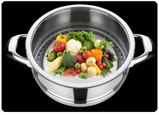 véritable "vapeur douce" mais sans les contraintes habituelles de la cuisson à l’étouffée (1) et de la cuisson à la vapeur traditionnelle (2) :